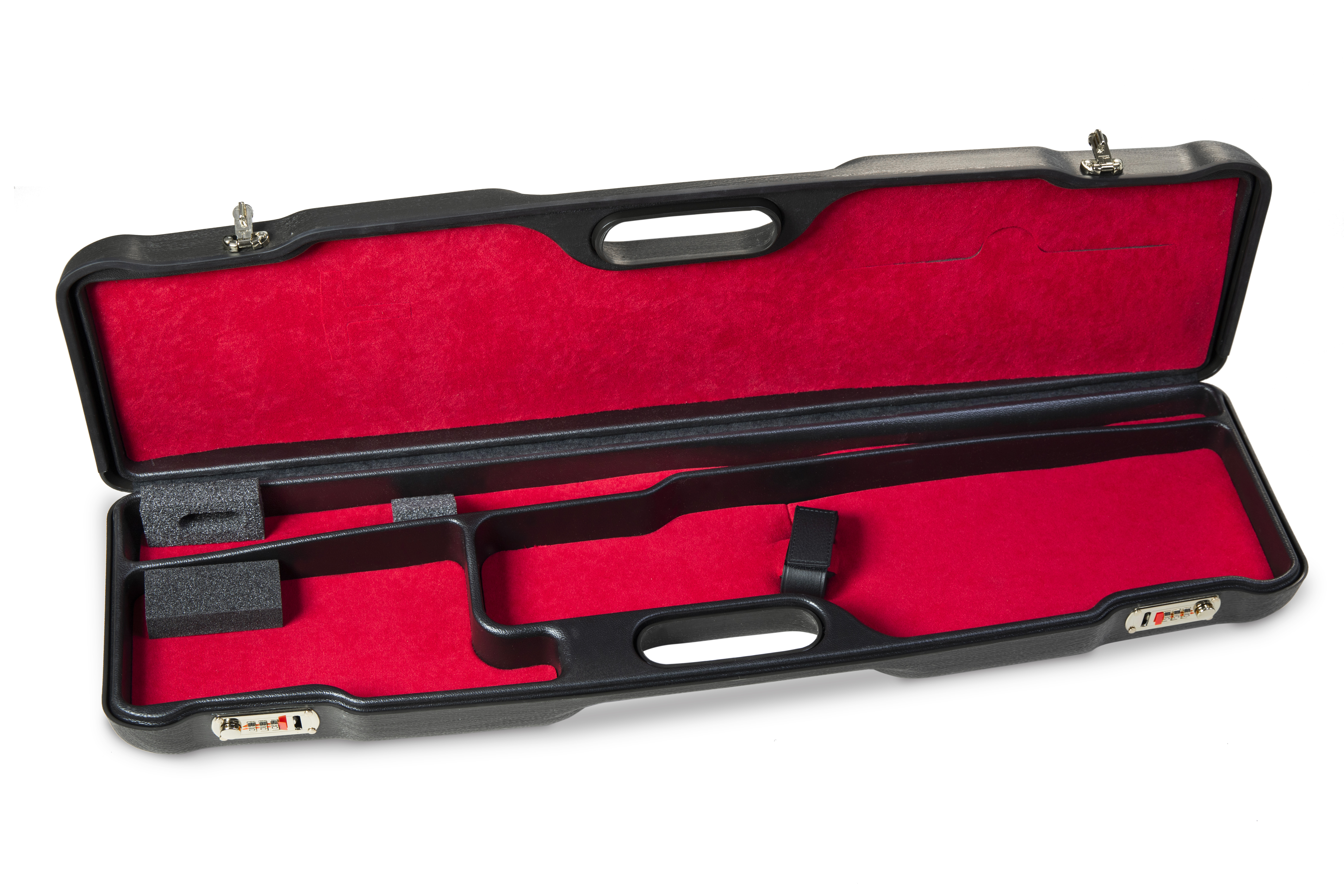 Koffer aus P.P. mit geformtem ABS-Innenraum, der mit Samt bezogen ist und mit dem Schwamm verbunden ist; geeignet für ein überlappendes Gewehr mit einem Lauf bis zu 78 cm. Ausgestattet mit zwei Metall-Zahlenschlössern.